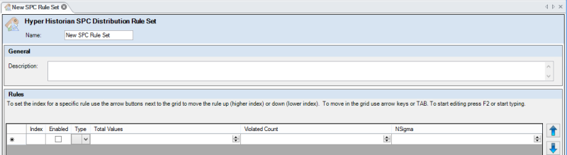 select the SPC Distribution Rule Set option. You can also select the SPC Distribution Rulesfolder, then go to the Edit group of theHomeribbon and selectAdd>SPC Distribution Rule Set. The Hyper Historian SPC Distribution Rule Set dialog appears, as shown below:Hyper Historian SPC Distribution Rule Set for a New Rule Set