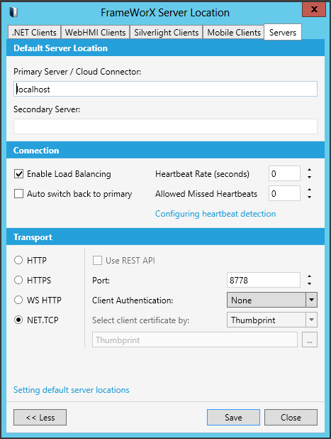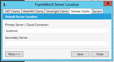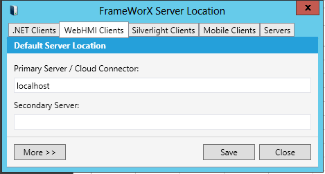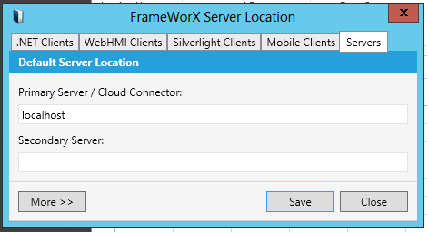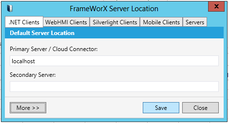 The window allows you to configure settings for your default FrameWorX Server location with use by the following clients: