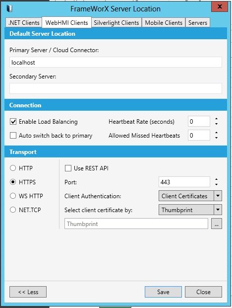 In the Transport section, select the Transport Protocol (choose either HTTP or HTTPS). Note that a proper Port is selected for each protocol. If you change the port number here, you must also change it for the FrameWorX Server. This must be done manually.