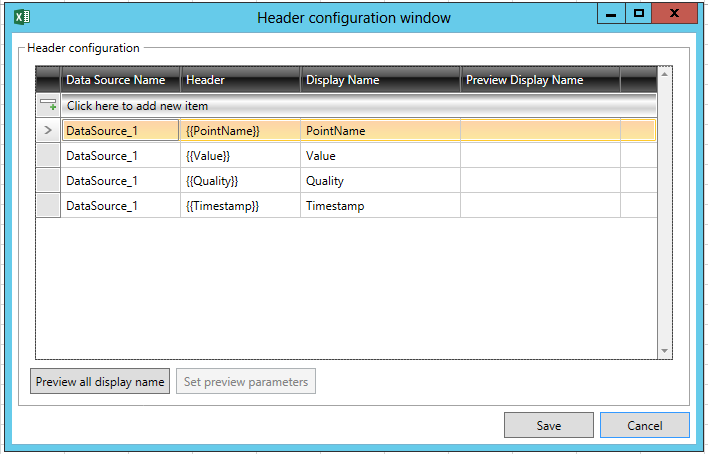 The Header configuration window shows the data source's Data Source Name, Header, and Display Name. You can click on the Preview all display name button to fill in the Preview Display Name column. You can also opt to Set preview parameters.