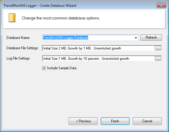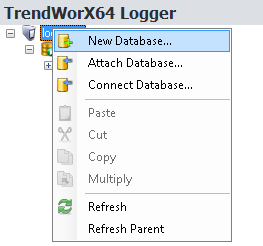 TrendWorX64 Logger creates the new database file which should automatically appear in the TrendWorX64 Logger Configurator tree explorer. If the database name does not appear within a few seconds, click the Refresh button