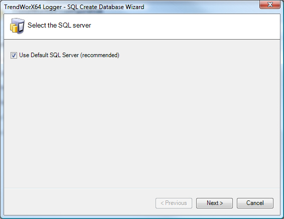 The SQL Database Wizard starts. By default the Use Default SQL Server (recommended) option is selected. If you want to use the Default SQL Server click the Next button and skip to step 4. Otherwise deselect the option and continue to step 3.