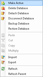Right click the name of an inactive database and select the from the context menu. You can also click the Database, Make Activecommand in the Edit group on theHomeribbon.