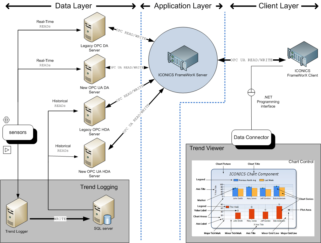 Application Layer or Logic Layer. The FrameWorX server manages the data connection between the different data sources to supply either real-time or historical OPC data to the TrendWorX64 Viewer .