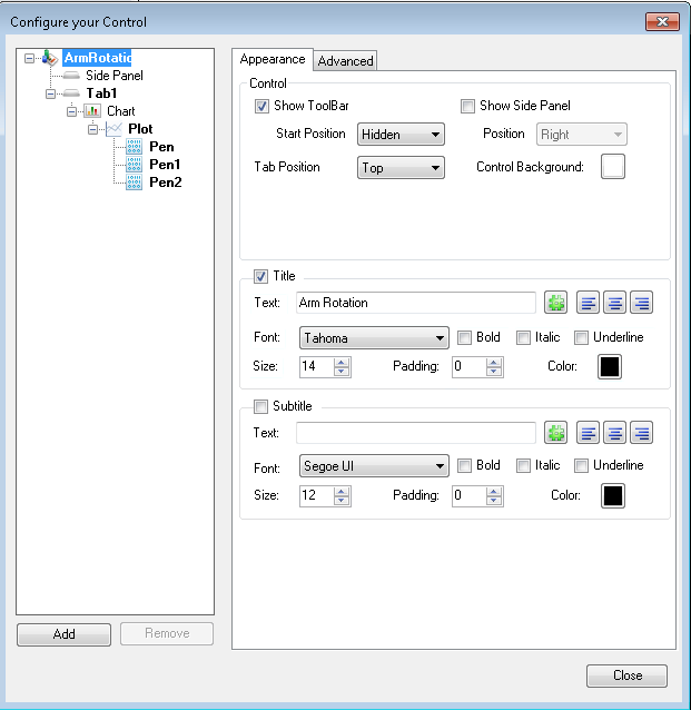 Add tabs, charts, plots, and pens to the viewer by following the guidelines in Working With Trends. A viewer can have any number of tabs, a tab can have any number of charts, and a chart can have any number of pens.