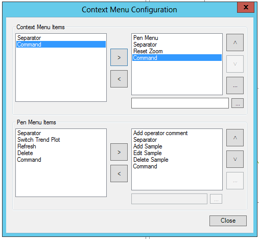 The Context Menu Configuration window allows users to add/remove/order both Context Menu Items (Separator, Command, Pen Menu, Reset Zoom) and Pen Menu Items (Separator, Switch Trend Plot, Refresh, Delete, Command, Add operator comment, Add Sample, Edit Sample, Delete Sample).