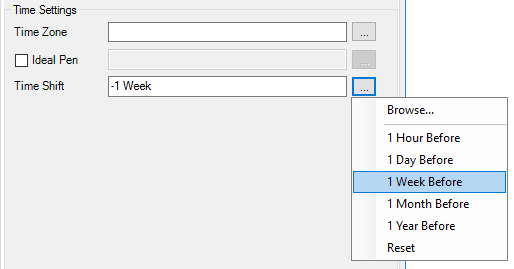 Users can use the time shift setting on the General tab of a pen to display the pen at a different timestamp than its original samples. The most common use case for this is to compare the recent history of a pen with a previous time period. For example, the same pen could be added twice, once with no time shift and once with a time shift value of -1 Week". This would let the user compare today's logged values to the same day last week.