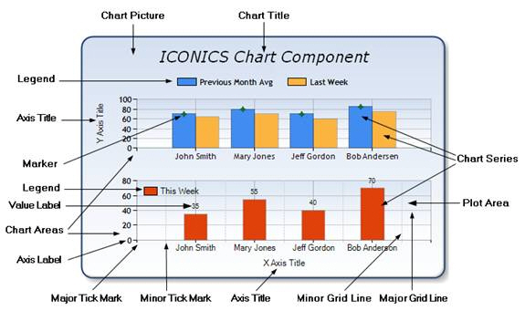 chart can contain different components that help you visualize your data. Certain elements such as the chart types affect the way that the data points are displayed. You can also show labels, a grid, axes, legends, and many other visual elements.