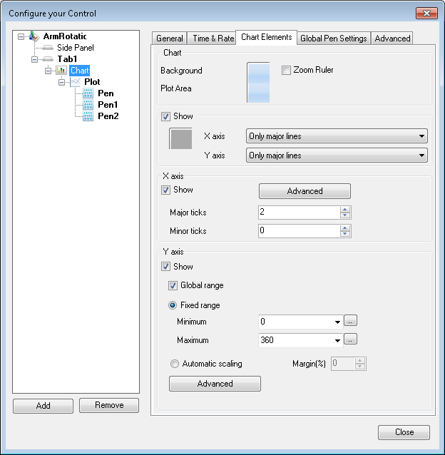 The chart's overall display properties are determined by the TrendWorX64 Viewer object. The object lets you set the grid, axes, legend, and some other properties. In the TrendWorX64 Viewer Configurator, the Viewer object has options on the following tabs: Appearance Tab and Advanced Tab.