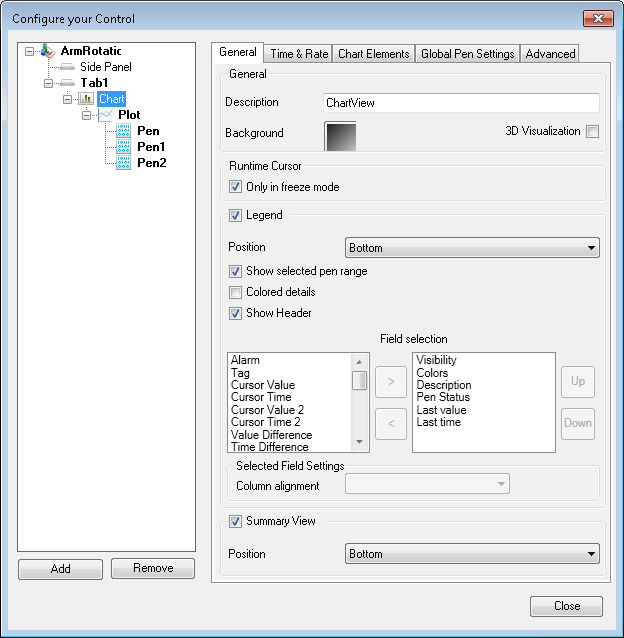 The primary settings for changing these settings are found in the tabs for Chart objects in the TrendWorX64 Viewer Configurator (General, Time & Rate, Chart Elements, and Global Settings). These tabs are described in the topic Chart Options for Trends.