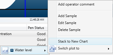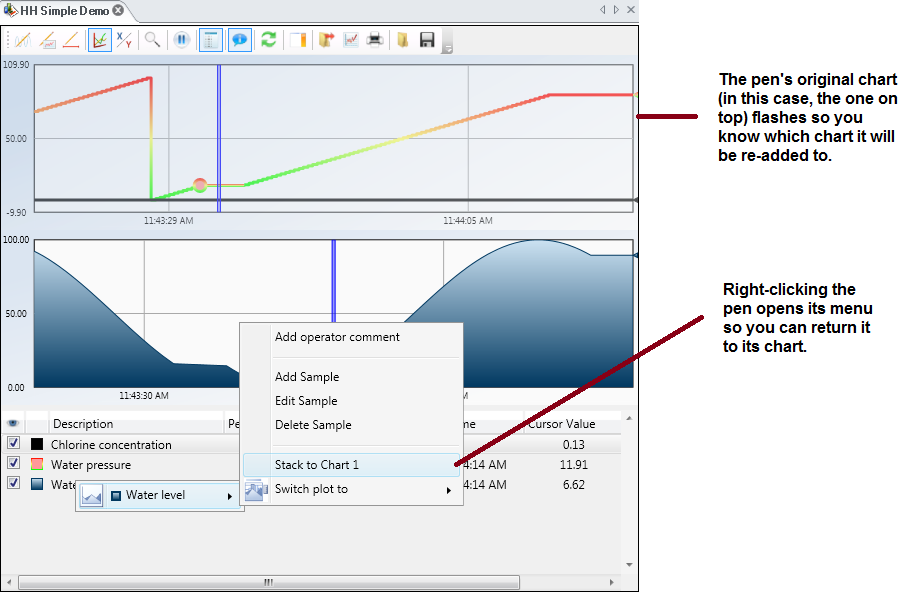 To re-add the pen to its original chart, right-click the pen in the legend, expand its menu, then click the chart you want to return it to.
