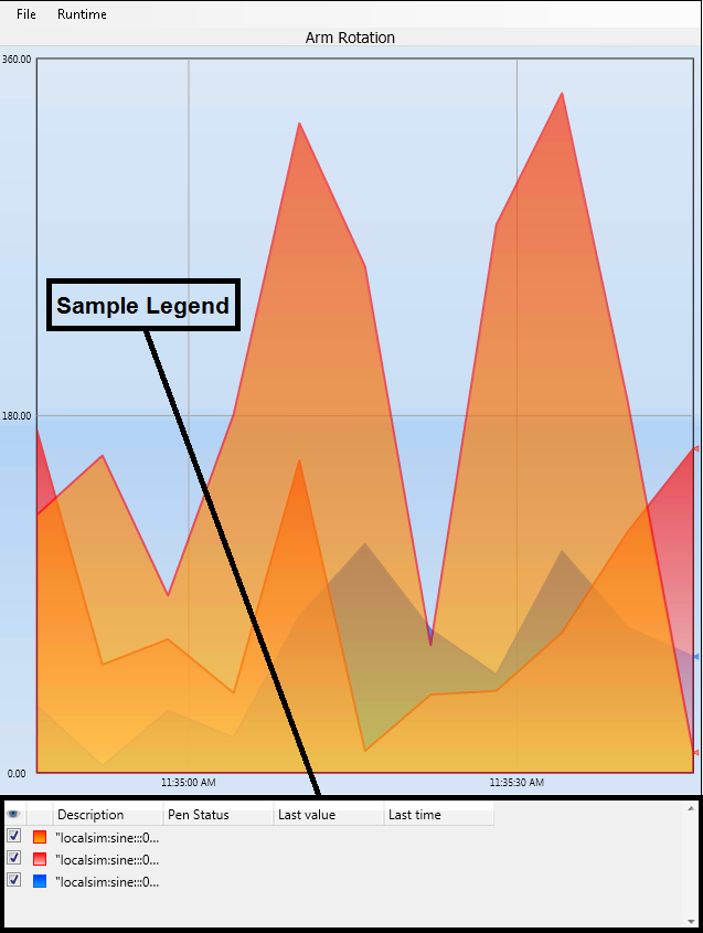 Click the Show/Hide Legend button on the runtime toolbar to display the legend. You can also click theLegendbutton in the Trend Layout group on theTrendWorX64 Runtimeribbon.