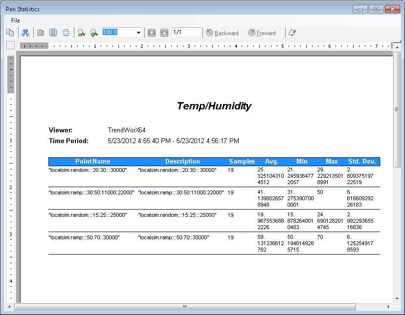 When viewing trend data in runtime within TrendWorX64 Viewer, you can get a report that lists statistics relating to the data each pen is writing. You can give the report a title and can specify what, if any, heading information you want included in the report.