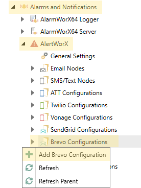 1. Go to Alarms and Notifications>AlertWorX>Brevo Configurations. Right Click and choose Add Brevo Configuration