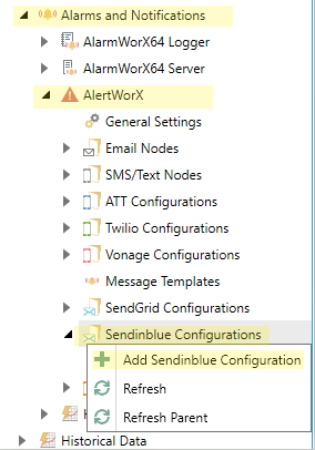 1. Go to Alarms and Notifications>AlertWorX>Sendinblue Configurations. Right Click and choose Add Sendinblue Configuration