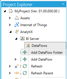 Open the Workbench and expand the AnalytiX node and then the BI Server Node. Select the Data Flows node, then select Add Data Flow Folder as shown below.