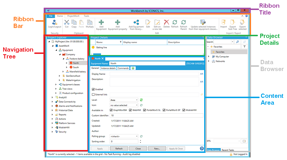 A Ribbon Bar, which includes several buttons for common actions intended for the different Workbench providers as well as general settings. This ribbon bar (in particular the Home ribbon) changes based on the element in the navigation tree that you have selected. For more information about options that appear in the ribbon, see the Ribbon topic.