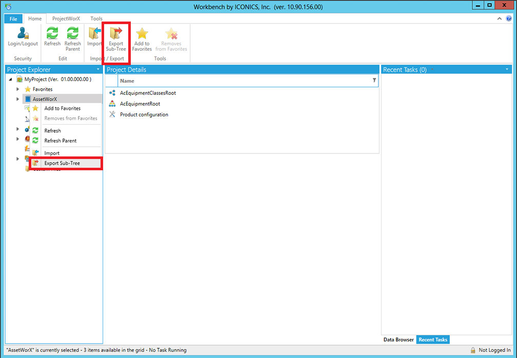 In the Workbench, go to AssetWorX's Project Explorer. Right-click on the node you are exporting, then select Export Sub-Tree, as shown below. Or click on the node, then click the Export Sub-Tree button in the Import/Export section of the Home ribbon.