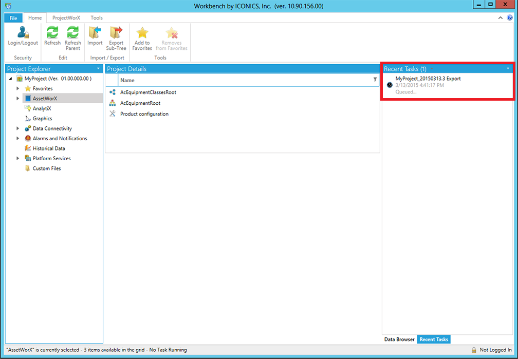 Click OK. The export process begins. At the same time, the Export task can be seen in the Recent Tasks pane of the Workbench, in the right side of the window, as shown below.