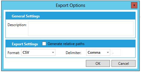 The Export Options dialog box opens, as shown below. In the General Settings section, you can enter a Description (optional) in the text entry field. In the Export Settings section, you can select the Format in which the data is to be exported (CSV, Microsoft Excel workbook, or XML). Specify the Delimiter to be used in the file (Comma, Tab, or Other [character]). Also specify whether to Generate Relative Paths for the exported data by checking or unchecking the check box.