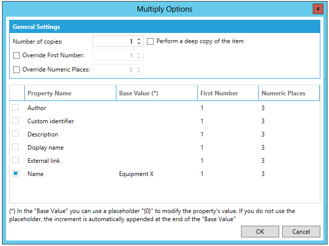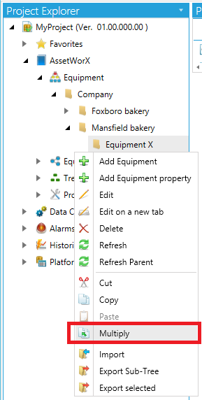 The Multiply command is particularly convenient for creating a number of new items such as equipment nodes or equipment classes in AssetWorX. You can use it to make multiple copies of an item in the Project Explorer. Use it to make three copies or 50 copies or more. In making multiple copies you can enter the formula to be used for populating fields in the copies: you can leave those fields unchanged, or you can specify a number to be appended to those values.