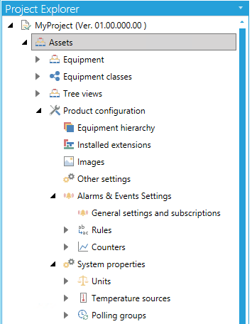 In AssetWorX, the Product Configuration node (shown in the image below) is where you set your system settings. For more information on a Product Configuration node, click on a hyperlink below: