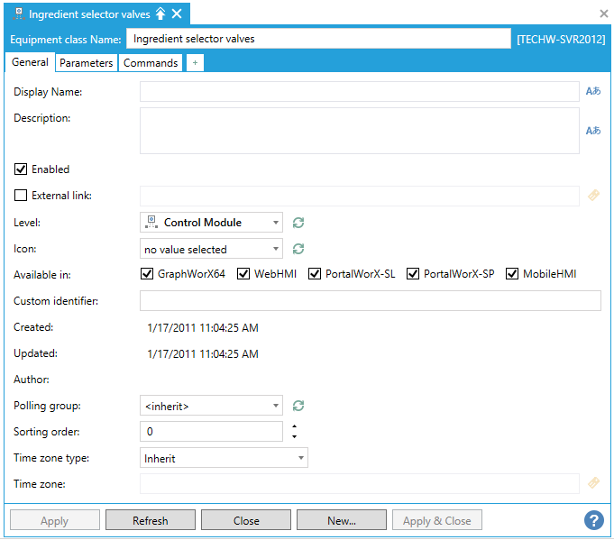 On the Properties tab for an equipment class (shown below), you can configure basic identifying information about an equipment node.