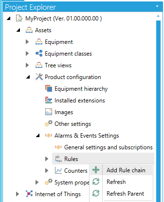 Open the Workbench and expand your project then the Assets node, then the Product configuration node, then the Alarms & Events Settings node, shown below. Right-click on the Rules node, then click on Add Rule Chain, as shown below.