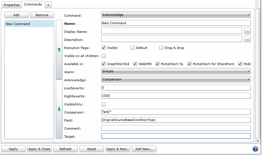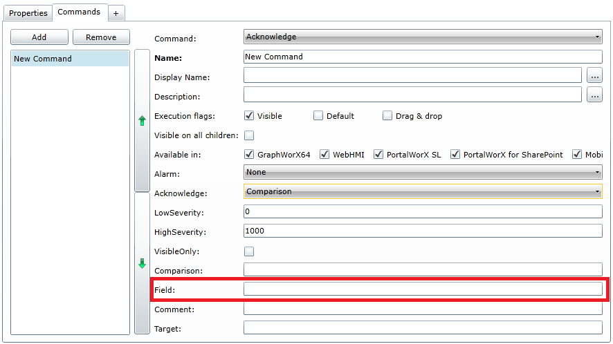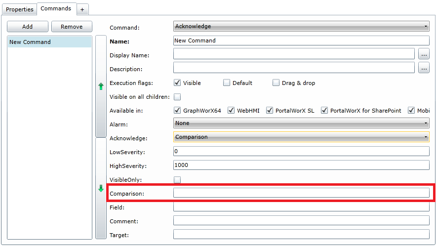 When configuring an Acknowledge command within Equipment in AssetWorX (for later use within an AlarmWorX64 Viewer control), you have the option of selecting 'Comparison' in the Acknowledge pulldown menu, as shown below. Once you have selected 'Comparison' from the Acknowledge pulldown menu, the 'Comparison' and 'Field' entries become active. You can then enter your point of comparison within the 'Comparison' field itself, as highlighted below in the red box.