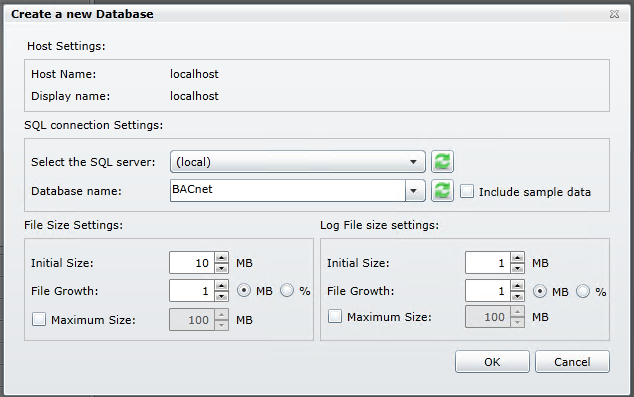 This will bring up the Create a new Database window. You can proceed in setting new connection settings. Select the SQL Server via a pulldown menu, provide a name for the Database and decide if you'd like to include sample data. You can also decide upon any additional File Size or Log File Size settings. Make your selections then click OK to proceed.