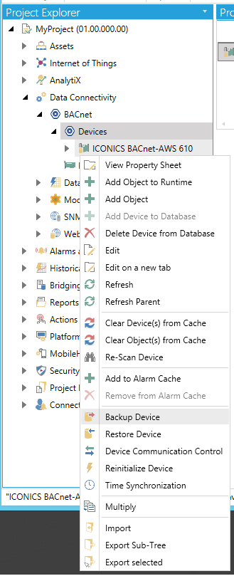 Expand theBACnetnode and then theDevicesnode. Right-click on the device you wish to back up, then click on Backup Device, as shown below.