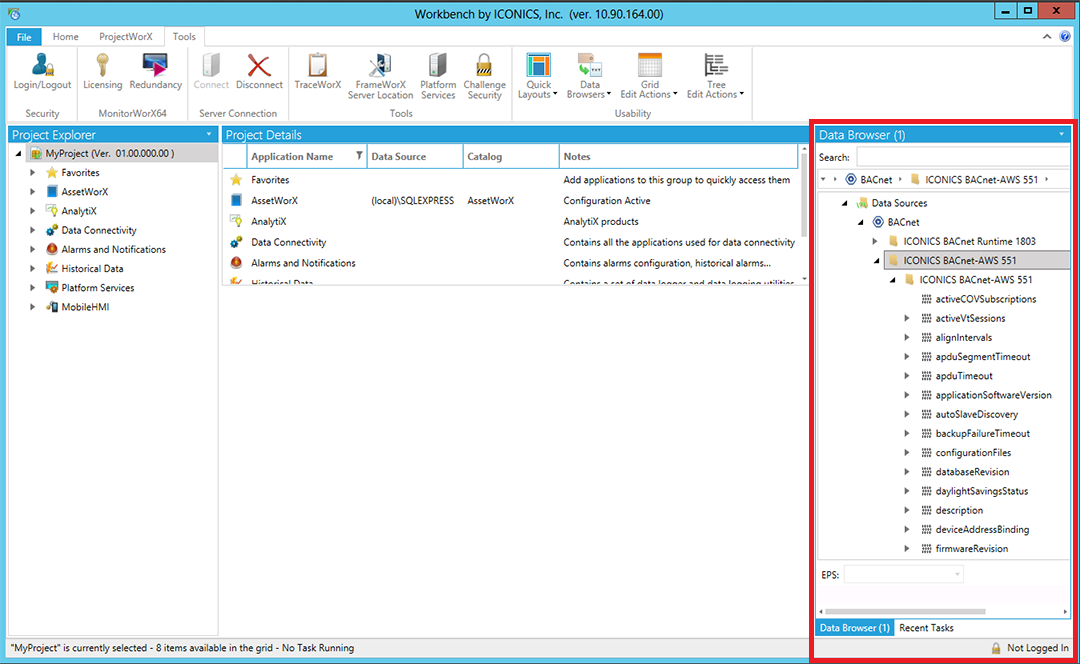 You can view BACnet data within the Workbench by viewing it within the Data Browser/Recent Tasks section (right-hand side pane) of the window, as shown below. Be sure to click on the Data Browser tab at the bottom of the pane.