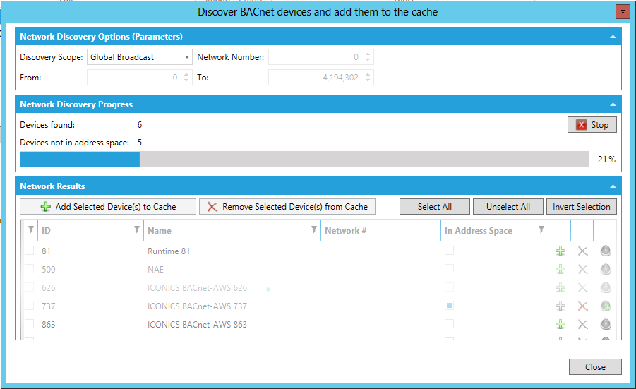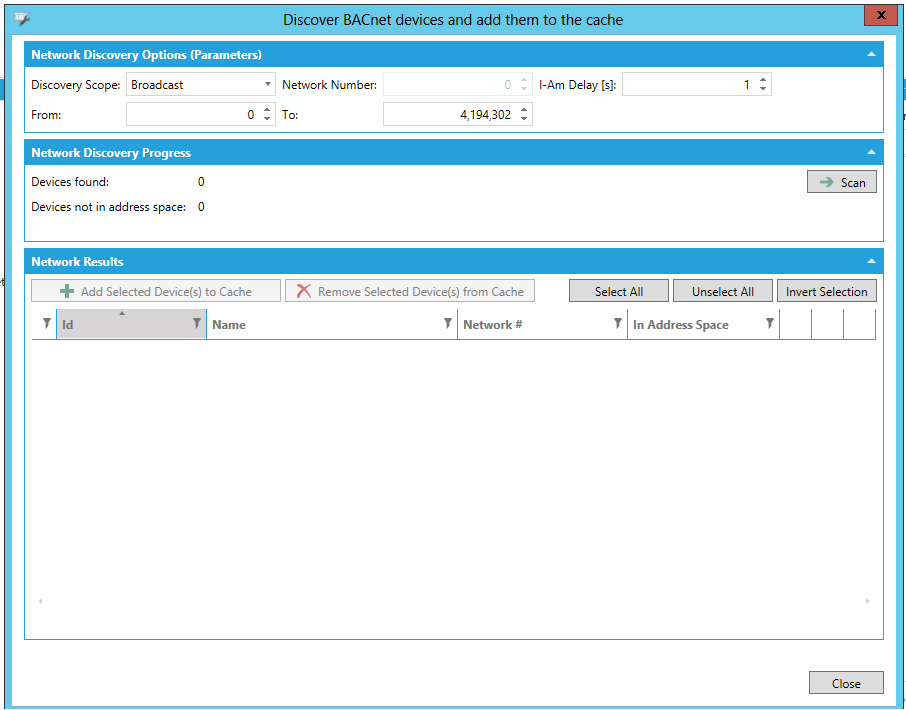 In order to discover BACnet devices and add them to the cache, you will need to perform a Network Discovery, by performing the following.