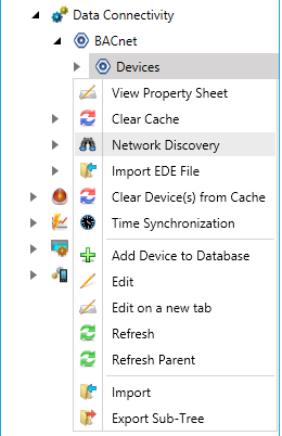 Right-click on the Devices branch of the BACnet provider in the Project Explorer in the Workbench, then click on Network Discovery, as shown below.