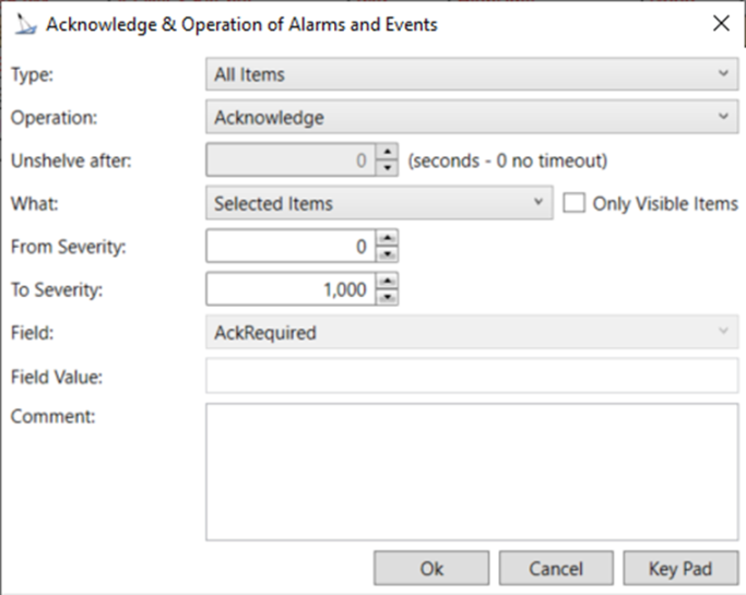 b. Right-click your desired row with unacknowledged notification and choose ‘Acknowledge’ from the context menu, then confirm the displayed dialog or change conditions within the displayed dialog in order to acknowledge more alarms or events at the same time.