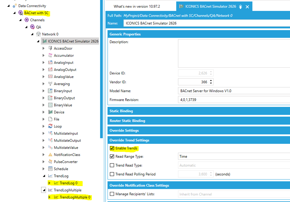 In the picture below, the trends are enabled on device level which cause subscribing to one TrendLog object and one TrendLogMultiple object (as highlighted in the picture).