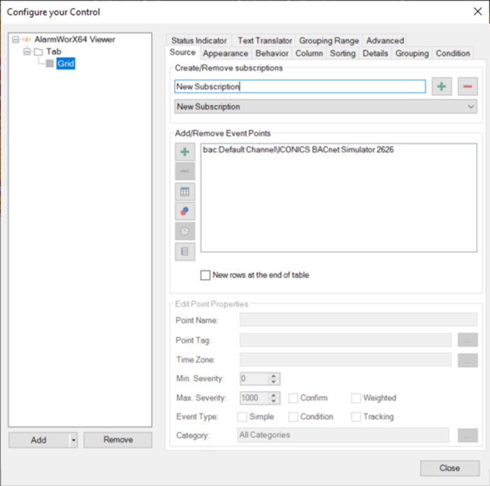6. Select the ‘Local Alarm Server’ listbox item in the ‘Add/Remove Event Points’ section and click the ‘-‘ sign in the same section to remove an existing subscription.
