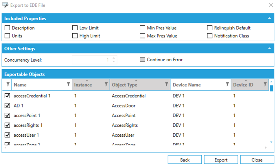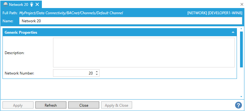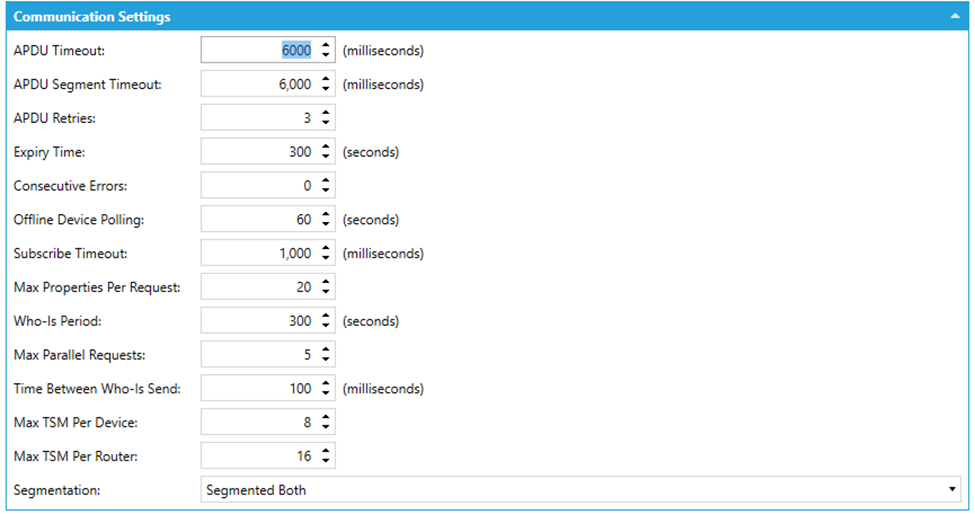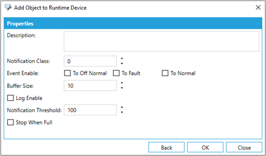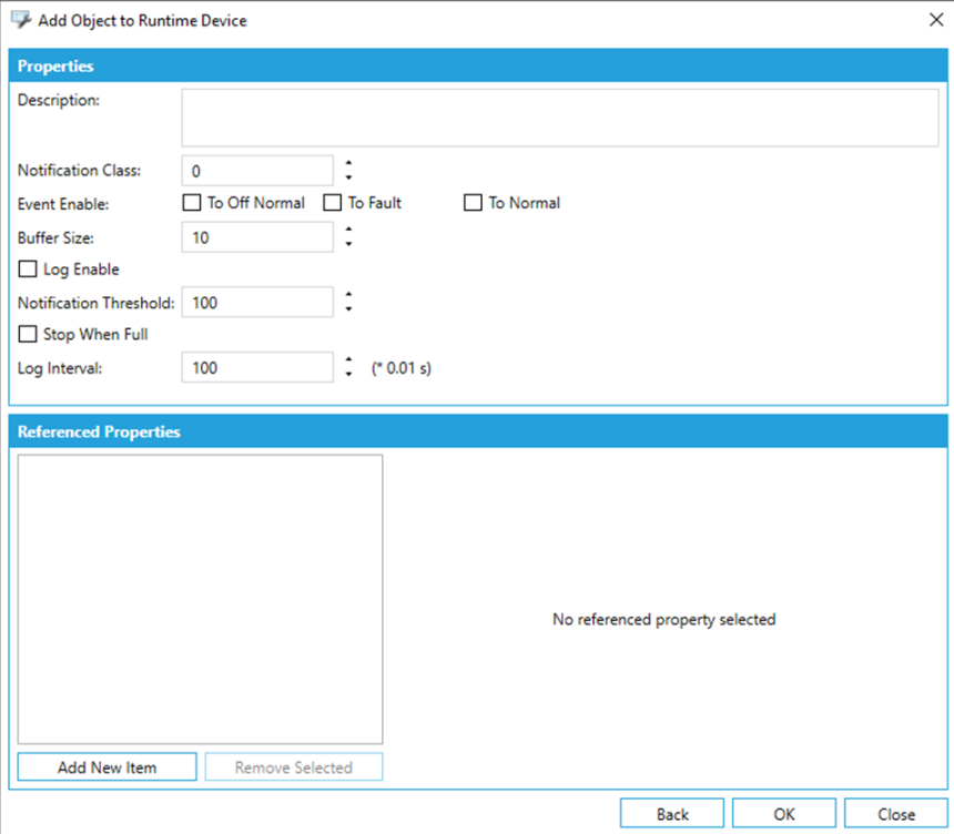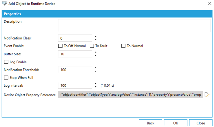 • Log Level - Specifies the level of logging for the BACnet stack log file. You can choose between None, Error, Info, Warning, Network, Debug levels.