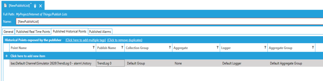 Configure the history pointsin the publish list under the Published Historical Points tab.