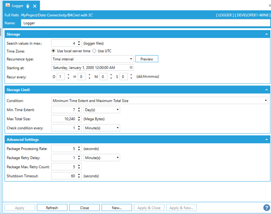 Once you have completed making updates to the Logger System Settings, click on the Apply button then on the Close button to return to the Workbench.