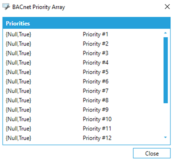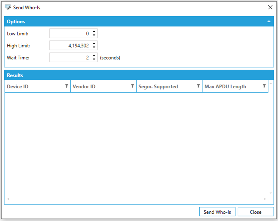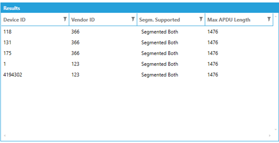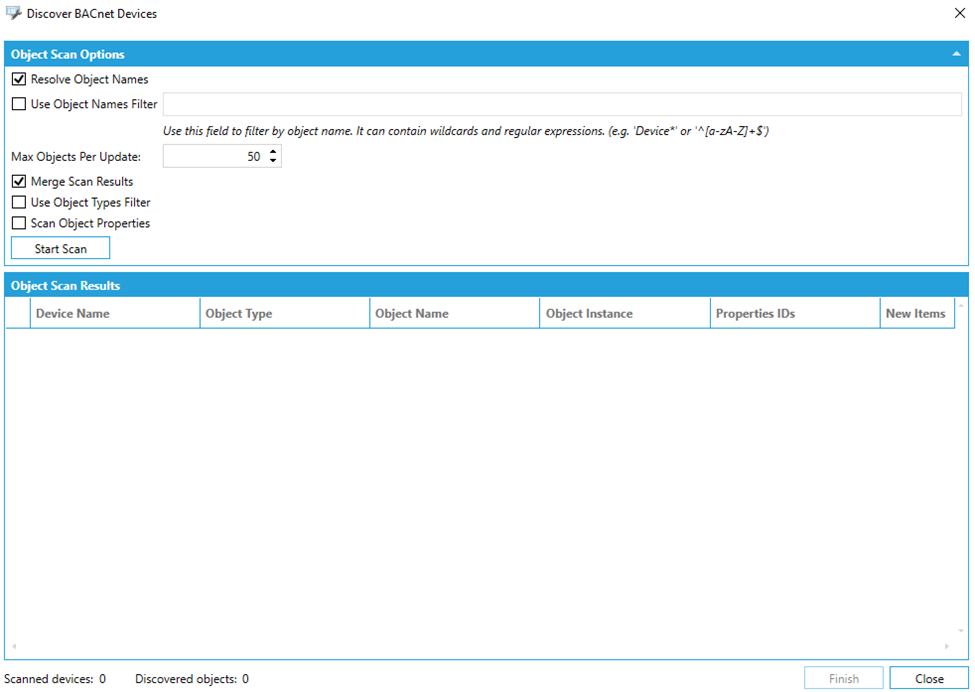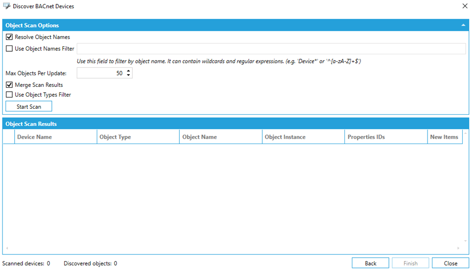 When you click on the Start Scan button, a request to the BACnet point manager is sent. The result of the call will populate the grid on the bottom of the dialog.