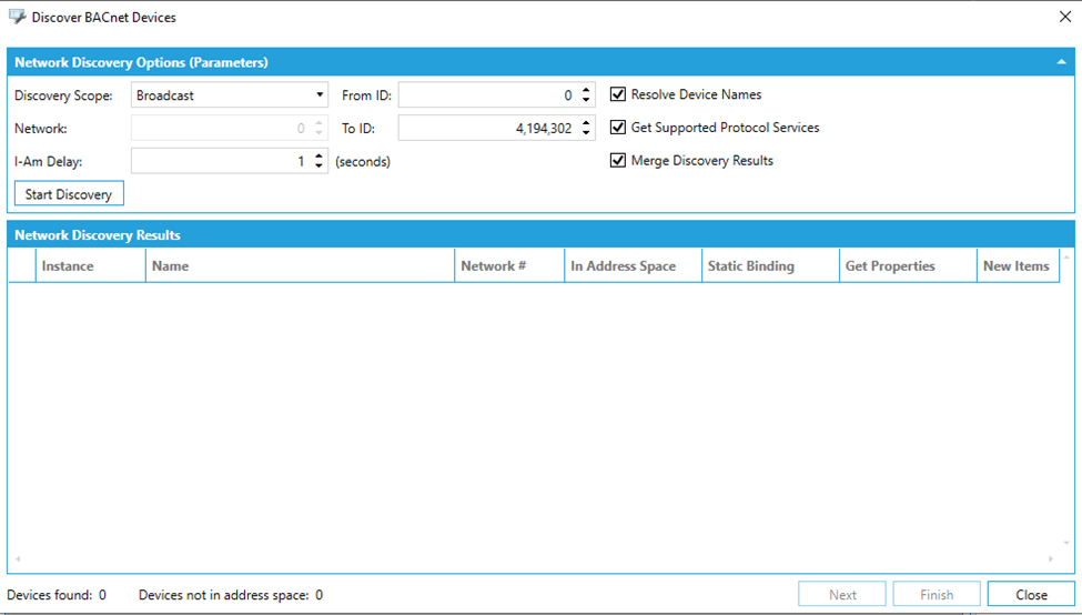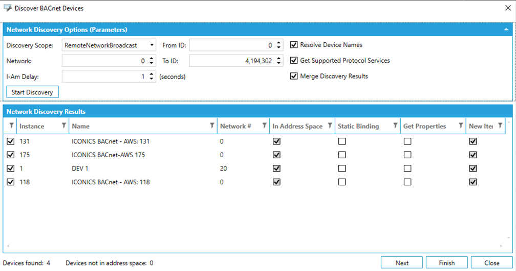 When you click on the Start Discovery button, a request to the BACnet point manager is sent. The result of the call will populate the grid on the bottom of the dialog.