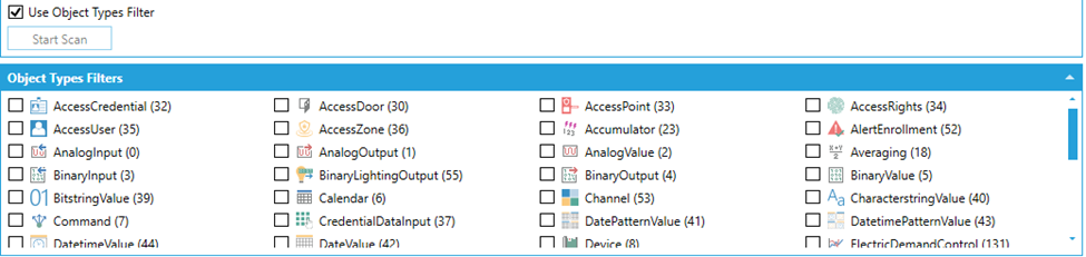 Network Discovery Dialog (Scan Devices) – Object Types Filters