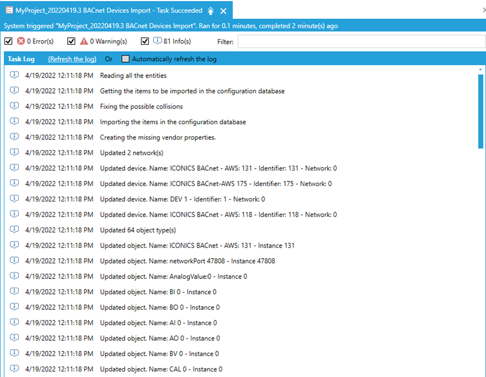 Note: The import operation will insert the new discovered entities and update the existing. It also provide a mechanism of collision detection in case of colliding names (for Devices and Objects). Since the operation is executed on a separate task, Workbench is fully available and responsive during the execution.