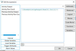 To the right of our newly mapped tag, click in the Output Expression cell, then on the ∑ icon, to open the expression editor. Clear out the existing expression, then on the left side, double-click on Previous Activity Output. Change Col[indexOrName] to Col[1] and Row[index] to Row[0]. This means we are copying the first row, second column of the dataset from our previous activity. Click OK to the expression editor.