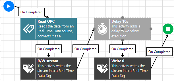 To finish our scenario, connect the End Activity to our diagram. Right-click our Write 0 activity to add a completed link. Drag this link to our previously added End Activity. Our diagram should look like the following image.