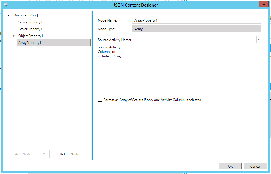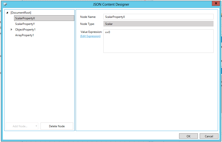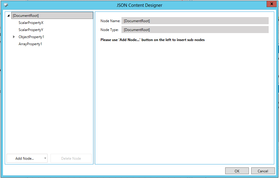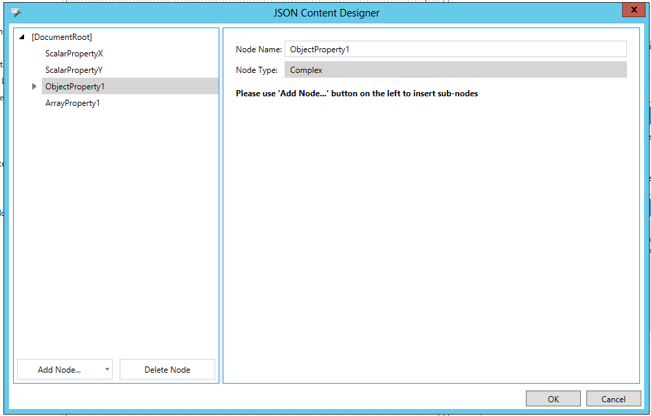 Click on the Add Node button to add either a Scalar Property, Object Property, or Array Property. You can also select an item in the left-side list and remove it via the Delete Node button.