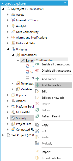 Open the Workbench and expand your project, then the Bridging node. Right-click on a Transaction Configuration beneath the Transactions node, then click on Add Transaction, as shown below.
