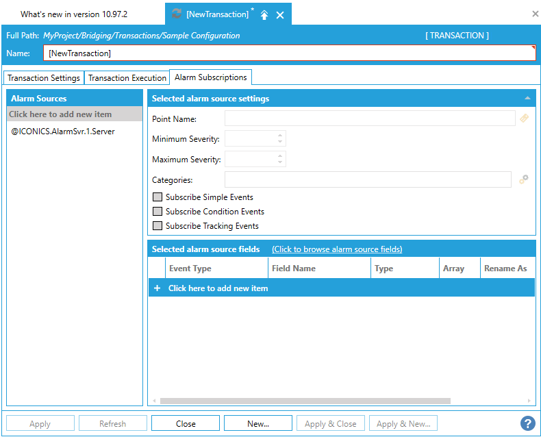 3. The Transaction Properties are separated into the Transaction Settings, Triggers, and Alarm Subscriptions tabs.