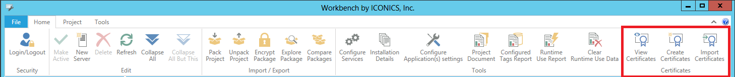 Certificates Section (Highlighted) in the Home Ribbon of the Workbench